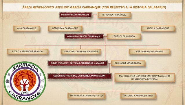 *Un Bisnieto de D. Gerónimo García Carranque llegó a ser 2º Marqués de Yebra: D. Gerónimo Francisco Carranque Mondragón, ya que, se casó con la 2ª Marquesa de Yebra, Dña. Manuela Vela López del Castillo y Caballero. El hijo de éstos últimos, D, Antonio Carranque Vela, fue 3º Marqués de Yebra.