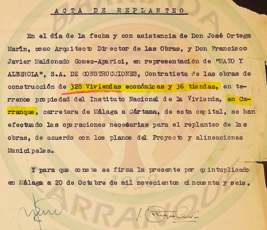 Además en la publicación del Diario Sur de la noticia de la colocación de la primera piedra de la barriada, que fue ubicada en la parcela donde se construiría la Iglesia se puede comprobar como vienen expuestos los nombres de los autores de la proyección de la futura barriada de Carranque, y se puede comprobar como no hacen referencia alguna al arquitecto Guerrero-Strachan Rosado.