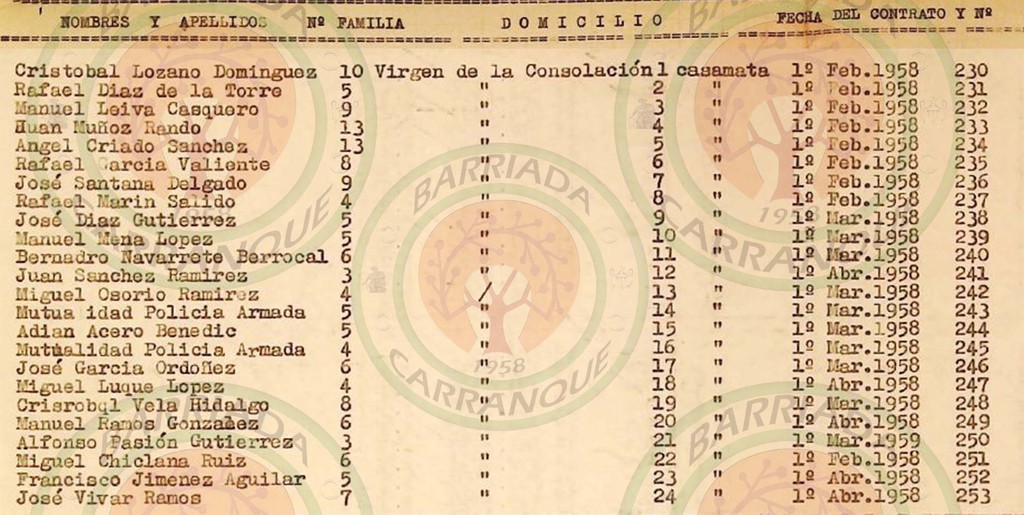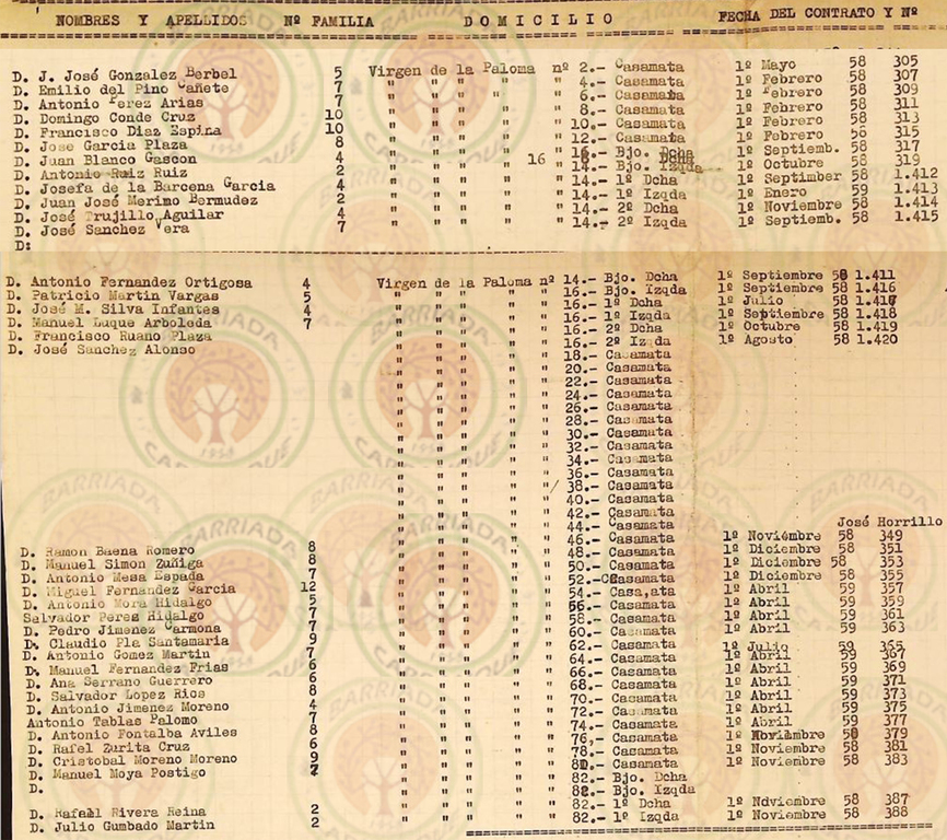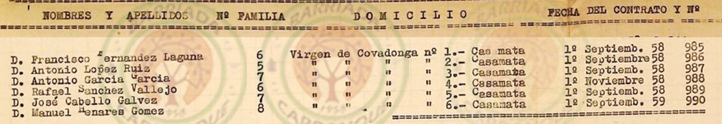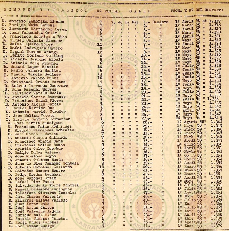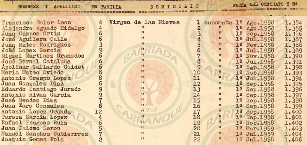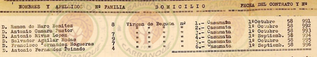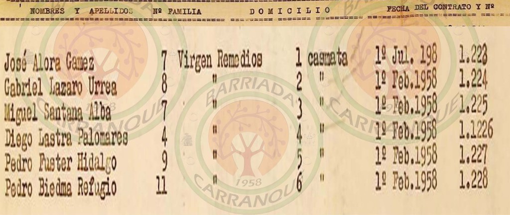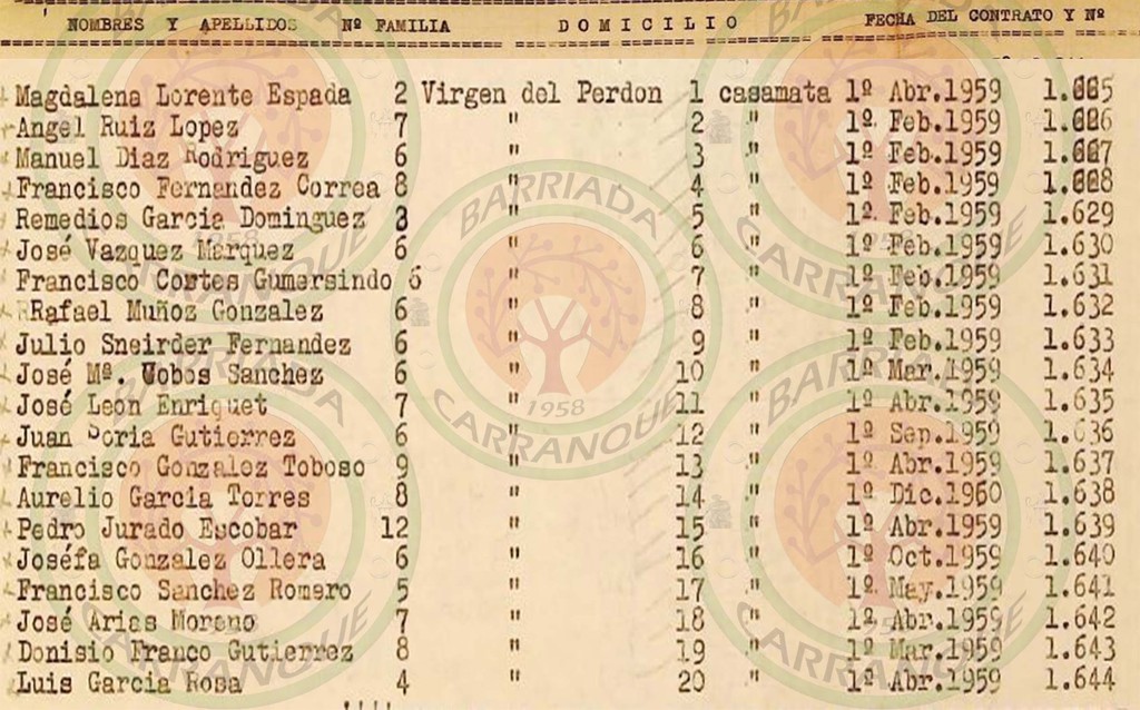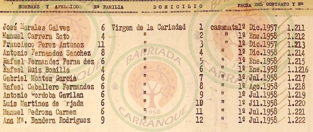 El 11 de abril de 1956, el Gobierno Civil informa a los Ex-Combatientes, que deben de presentarse en la Delegación, para que recojan la matriz con los números de ordenes adjudicados, ya que, estos tienen un cupo de viviendas asignado en la Barriada de Carranque.