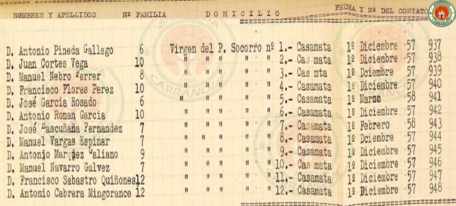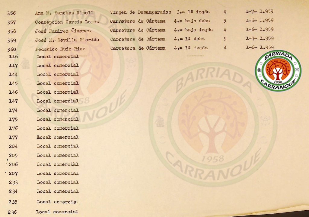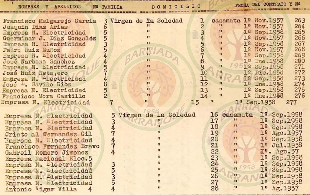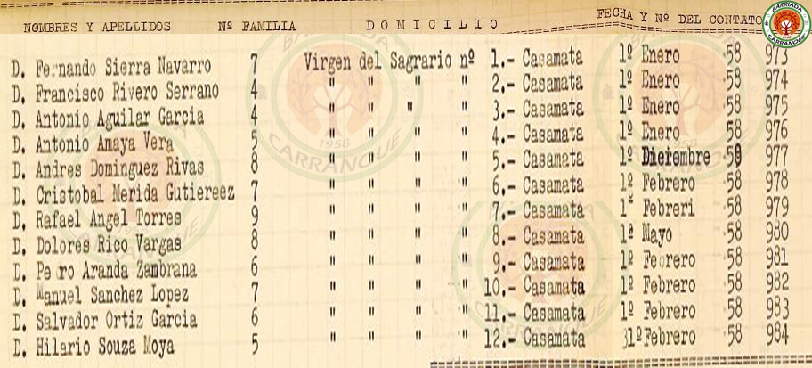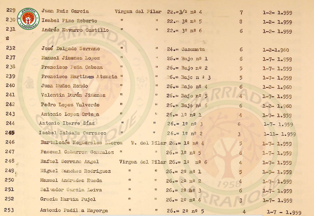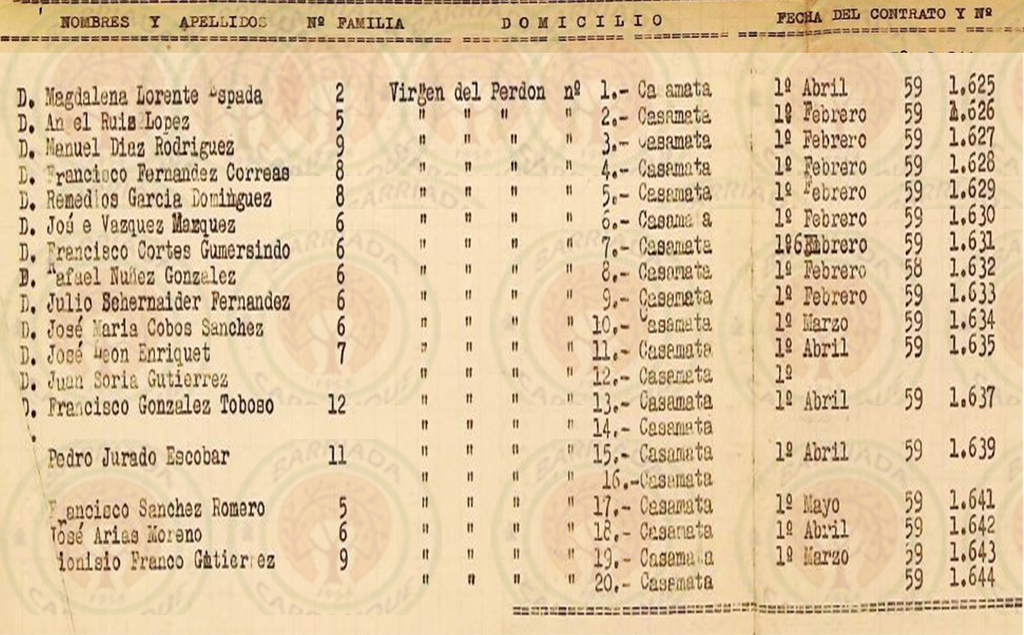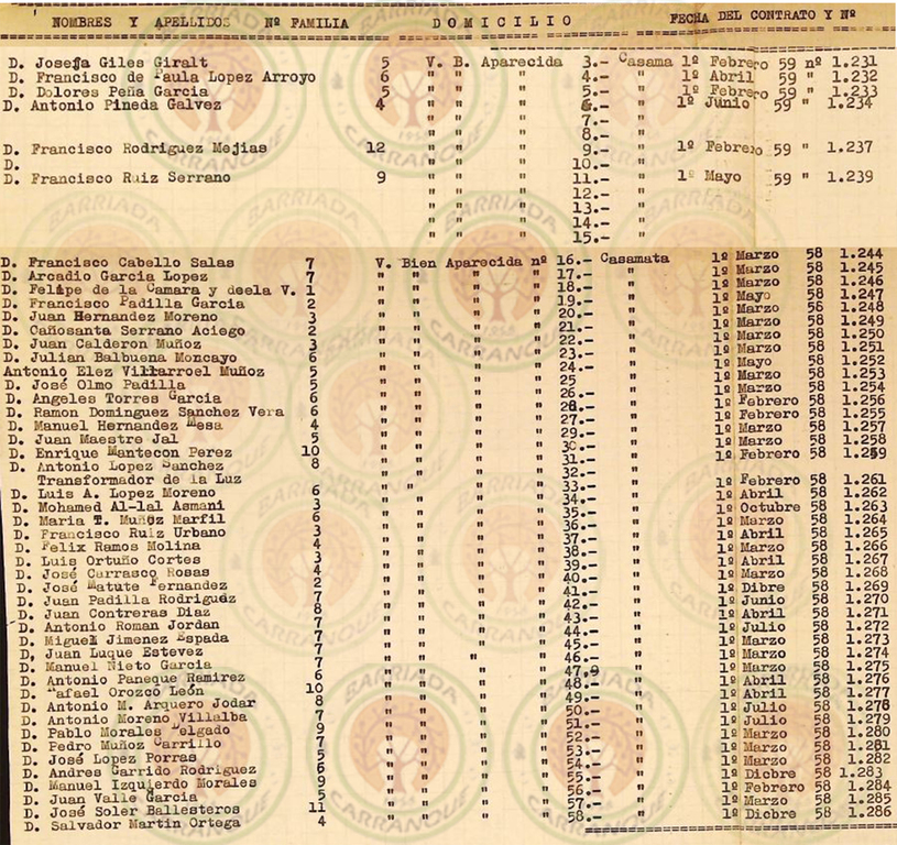 El 11 de abril de 1956, el Gobierno Civil informa a los Ex-Combatientes, que deben de presentarse en la Delegación, para que recojan la matriz con los números de ordenes adjudicados, ya que, estos tienen un cupo de viviendas asignado en la Barriada de Carranque.
