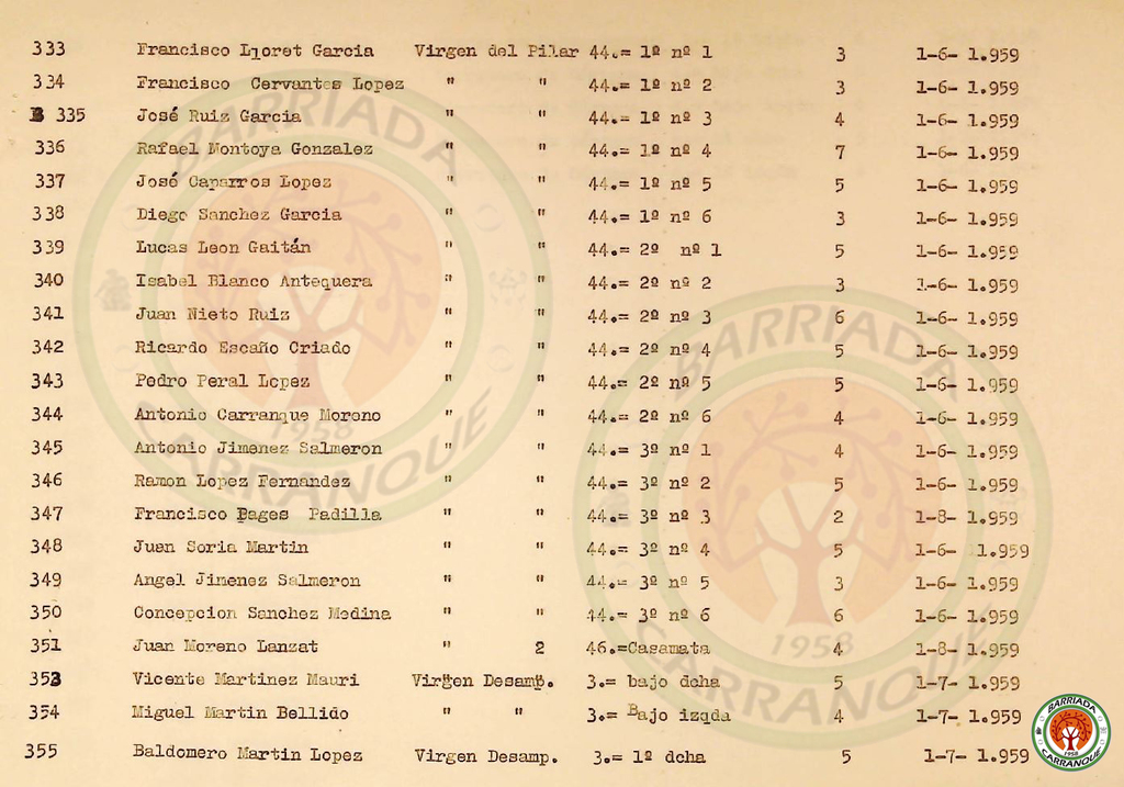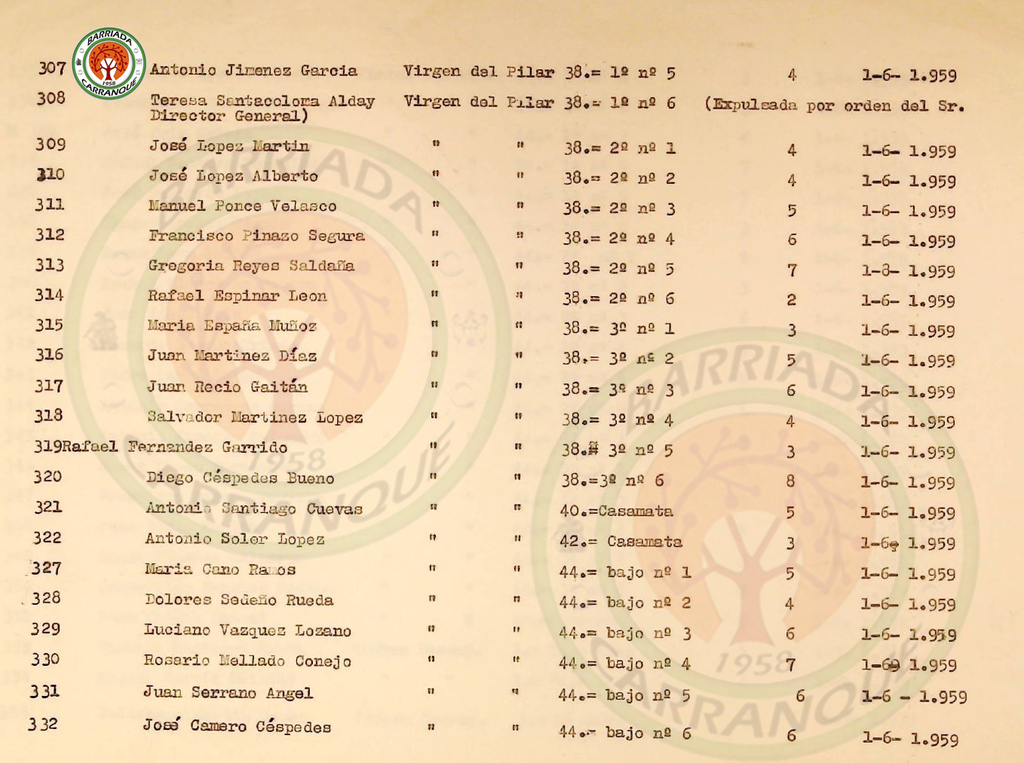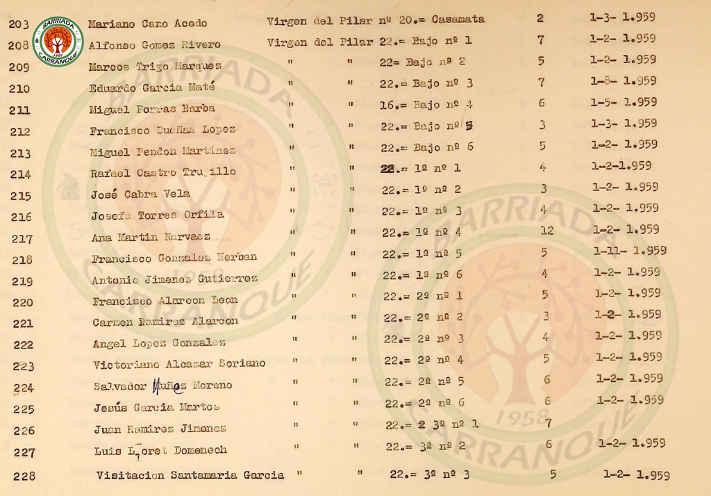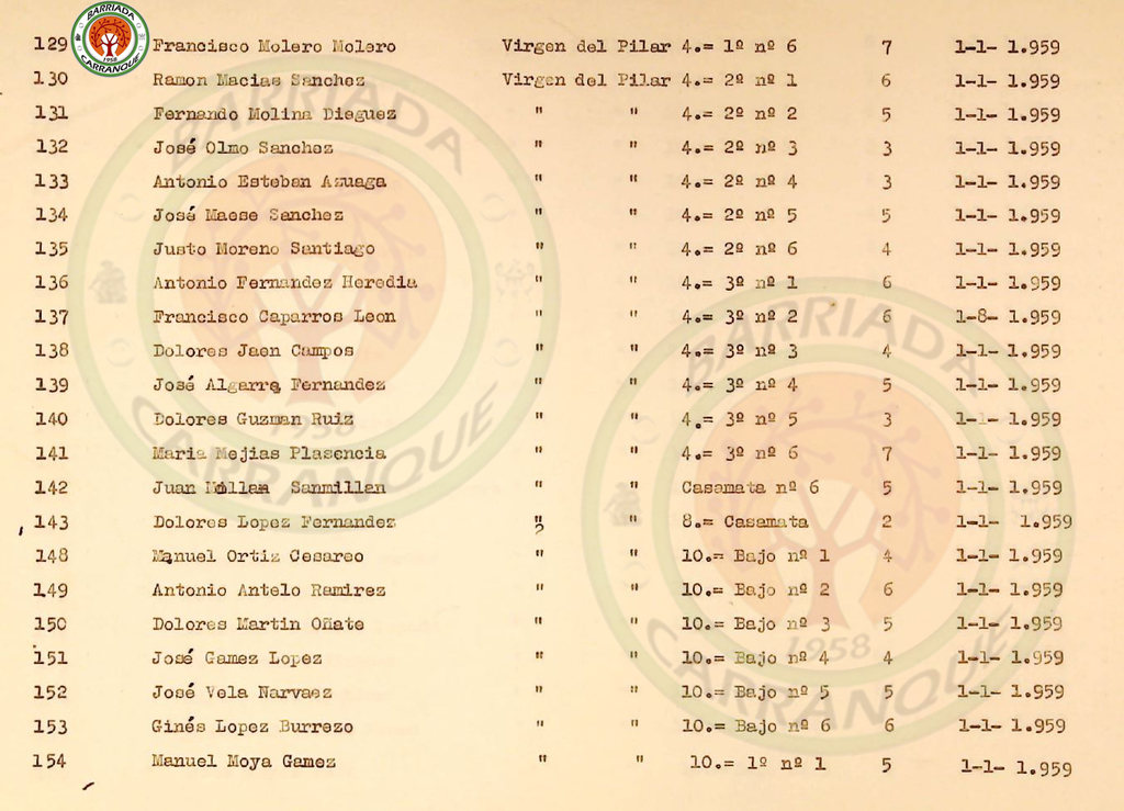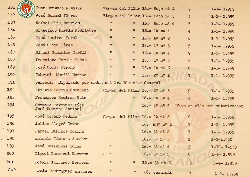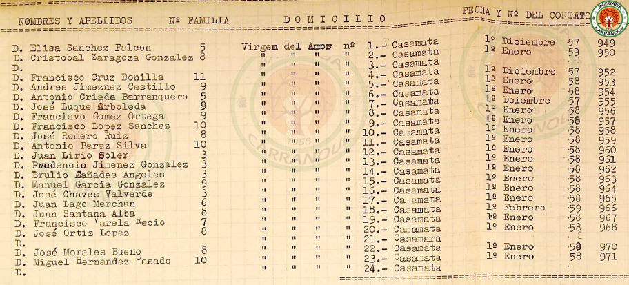 El 11 de abril de 1956, el Gobierno Civil informa a los Ex-Combatientes, que deben de presentarse en la Delegación, para que recojan la matriz con los números de ordenes adjudicados, ya que, estos tienen un cupo de viviendas asignado en la Barriada de Carranque.
